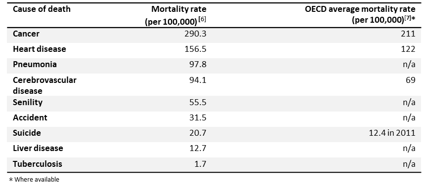 The total population hovers around 127 million people, with about 90% living in urban areas. As of 2015, about 36.5% of the total population resided in Tokyo, Kanagawa Prefecture, Osaka, Aichi Prefecture, or Saitama Prefecture. Among these, the largest proportion was in Tokyo, which was home to 10.7% of the total population of Japan.[1]
