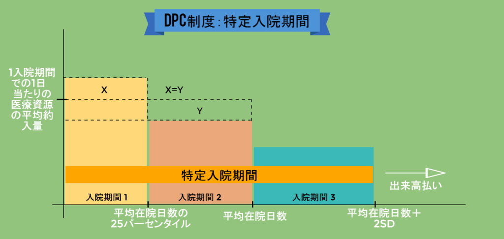 - 入院段階により算出方法が異なり、のうち入院期間Iにおける一日あたりの定額報酬は入院期間IIおよびIIIよりも高く設定されている。入院期間IIは第I日以降平均在院日数までを指し、この期間における定額報酬は診断群分類に応じて異なるものの、一日当たりの医療資源の平均投入量を加味した上で入院期間I よりも低く設定されている。入院期間IIIは特定入院期間として計算される最後の期間であり、一日当たりの定額報酬は入院期間IIより低く設定されている。例外的に入院期間IIIよりも入院が長期化する患者の診療報酬については、出来高払い方式で算出される。