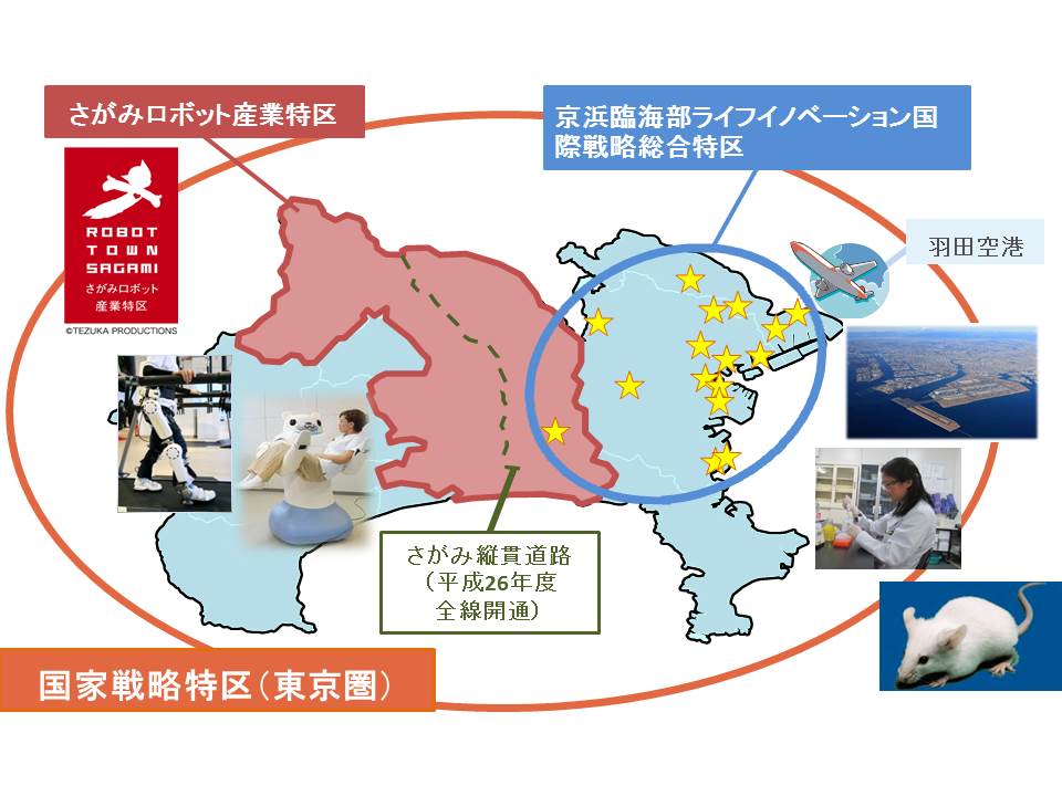 神奈川県では、ヘルスケア・ニューフロンティアの取組みを進めるにあたって、「京浜臨海部ライフイノベーション国際戦略総合特区」「さがみロボット産業特区」「国家戦略特区(東京圏)」の3つの特区を活用している。 神奈川県では、これら3つの特区を最大限に活用して、規制改革を進め、最先端医療関連産業、健康・未病産業、ロボット産業の創出を進めている。