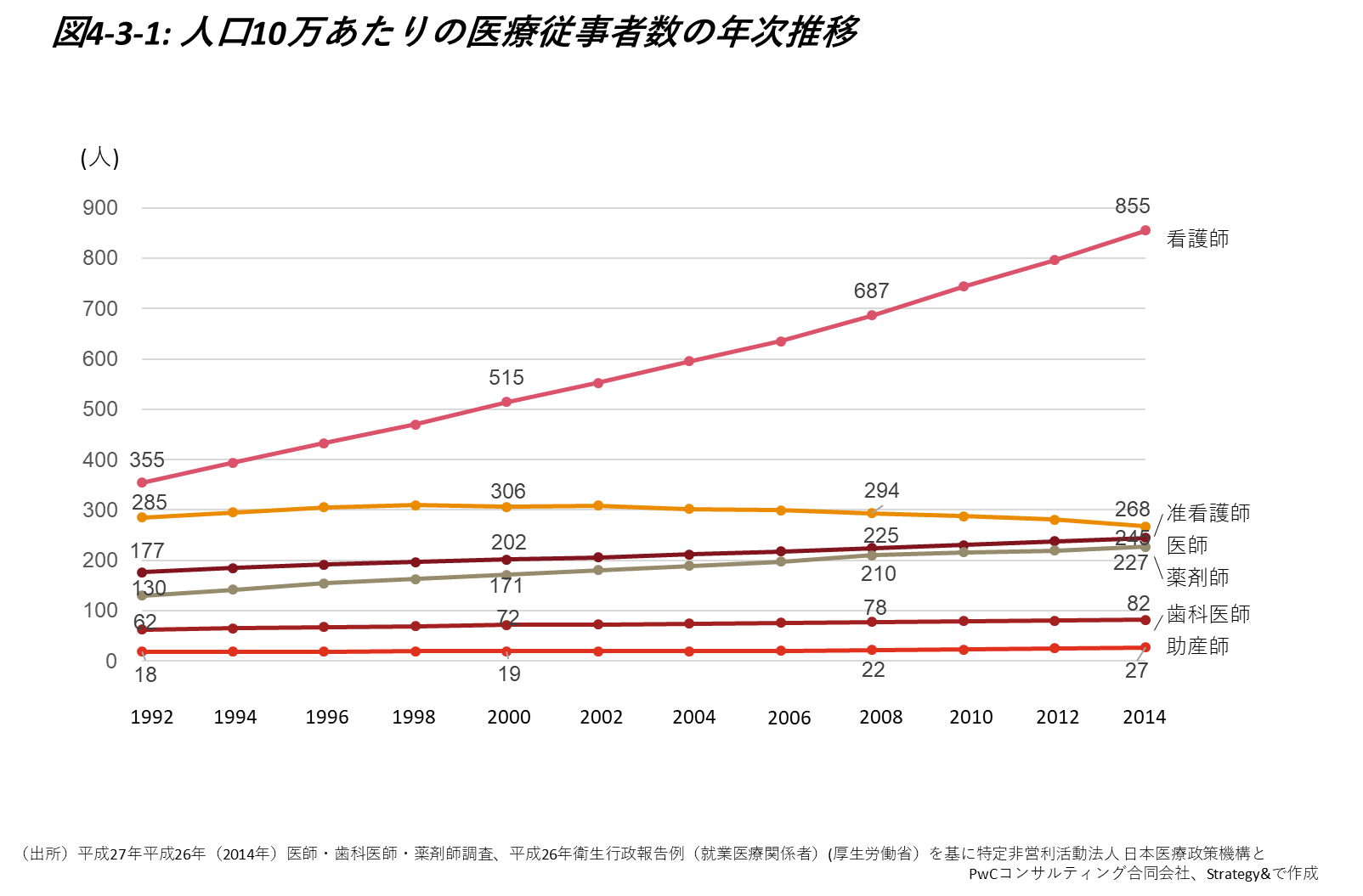 医療従事者数については、図4-3-1にあるように、看護師の人数が最も伸びている。医師数については、ほぼ横ばいの状態が続いているが、毎年約4,000人ずつ増え続けている状況である。
